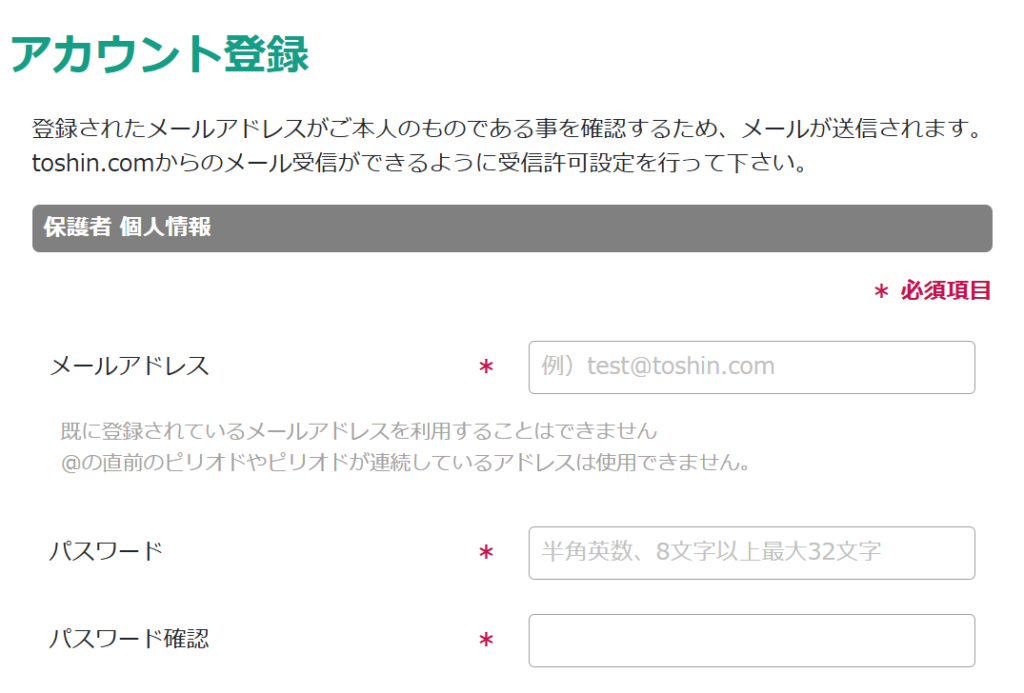 はじめて申し込む際は、まず公式サイトの「入会申し込み」ボタンを押すと、以下のようなアカウント登録画面に遷移します。